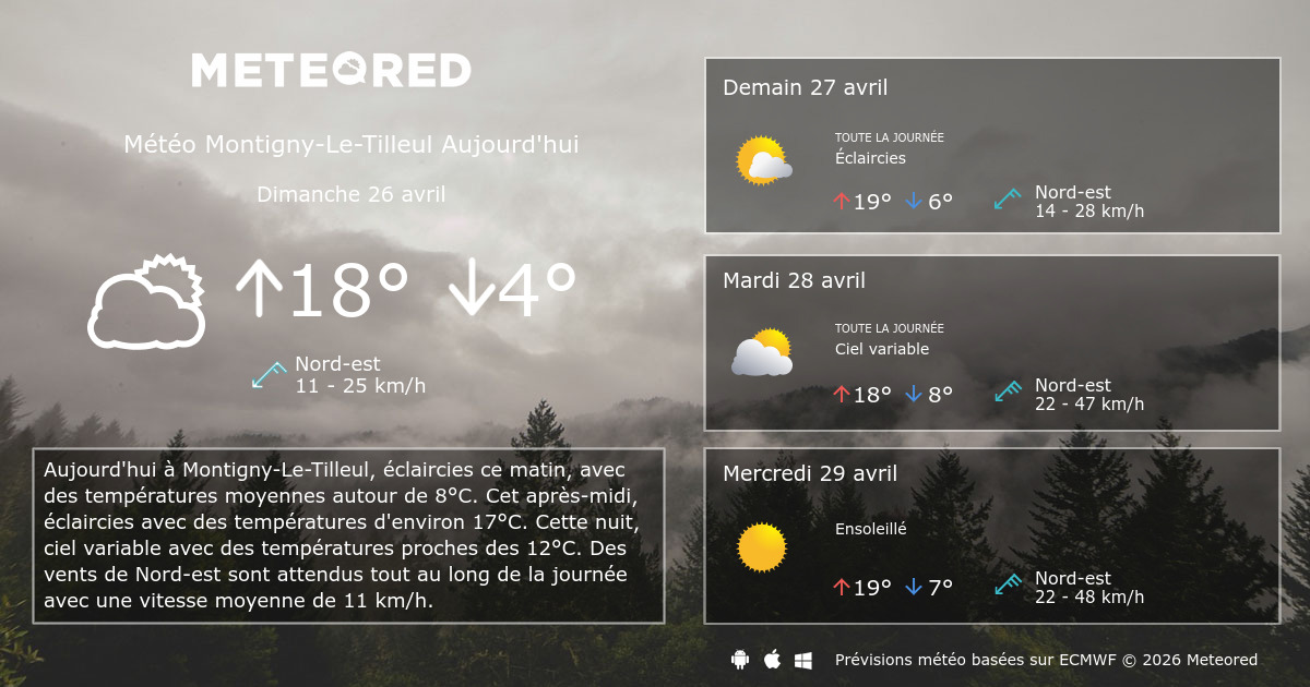 METEO FRANCE - Retrouvez les prévisions METEO LE TILLEUL de Météo-France pour aujourdhui demain et jusquà 15 jours ainsi que les prévisions météos locales par heure et. 30 ans de données météo historiques horaires pour Montigny-Le-Tilleul peuvent être achetées avec history. Durant laprès-midi quelques passages nuageux sont prévus. Les prévisions indiquent une possibilité modérée de précipitations autour de 40.
